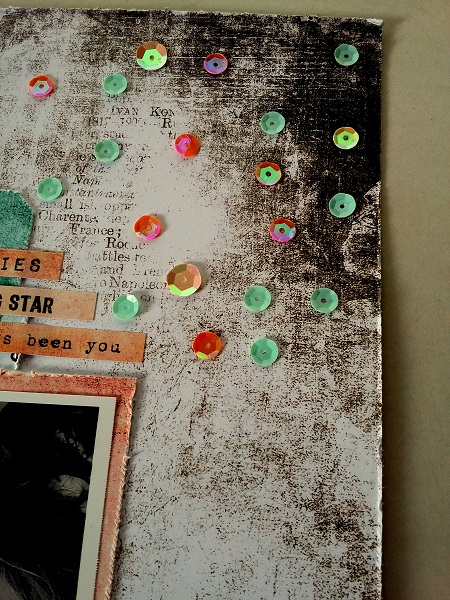 Seaglass WOW embossing powders. I coloured some really old white alpha stickers with Distress Ink in Carved Pumpkin and Cracked Pistachio. To finish off the layout I dded some sequins in orange and green. I have also distressed all paper edges.